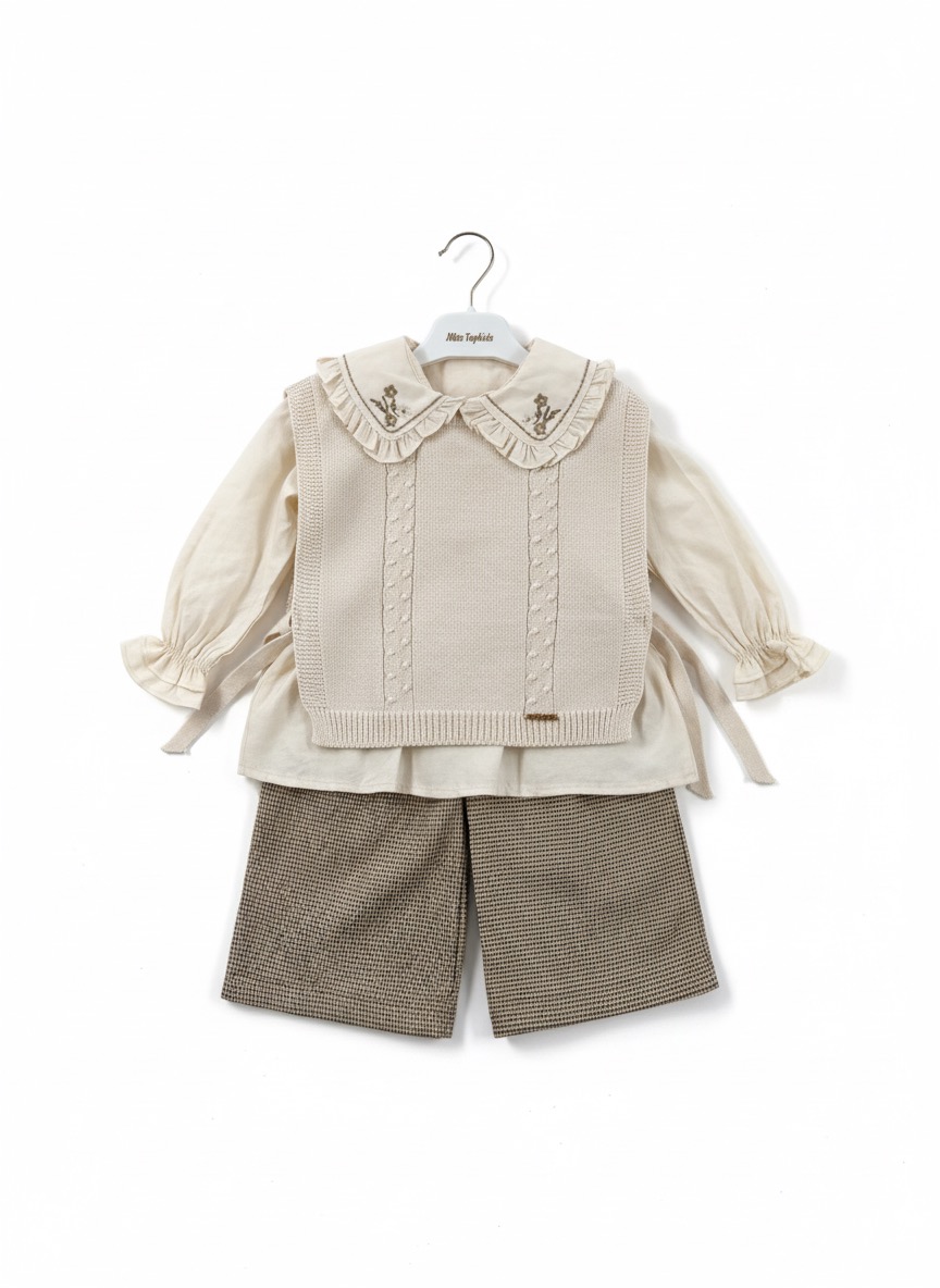 ست شامل سه تکه بلوز دکمه دار(نخی) و شلوار(بافت) وست(بافت) است